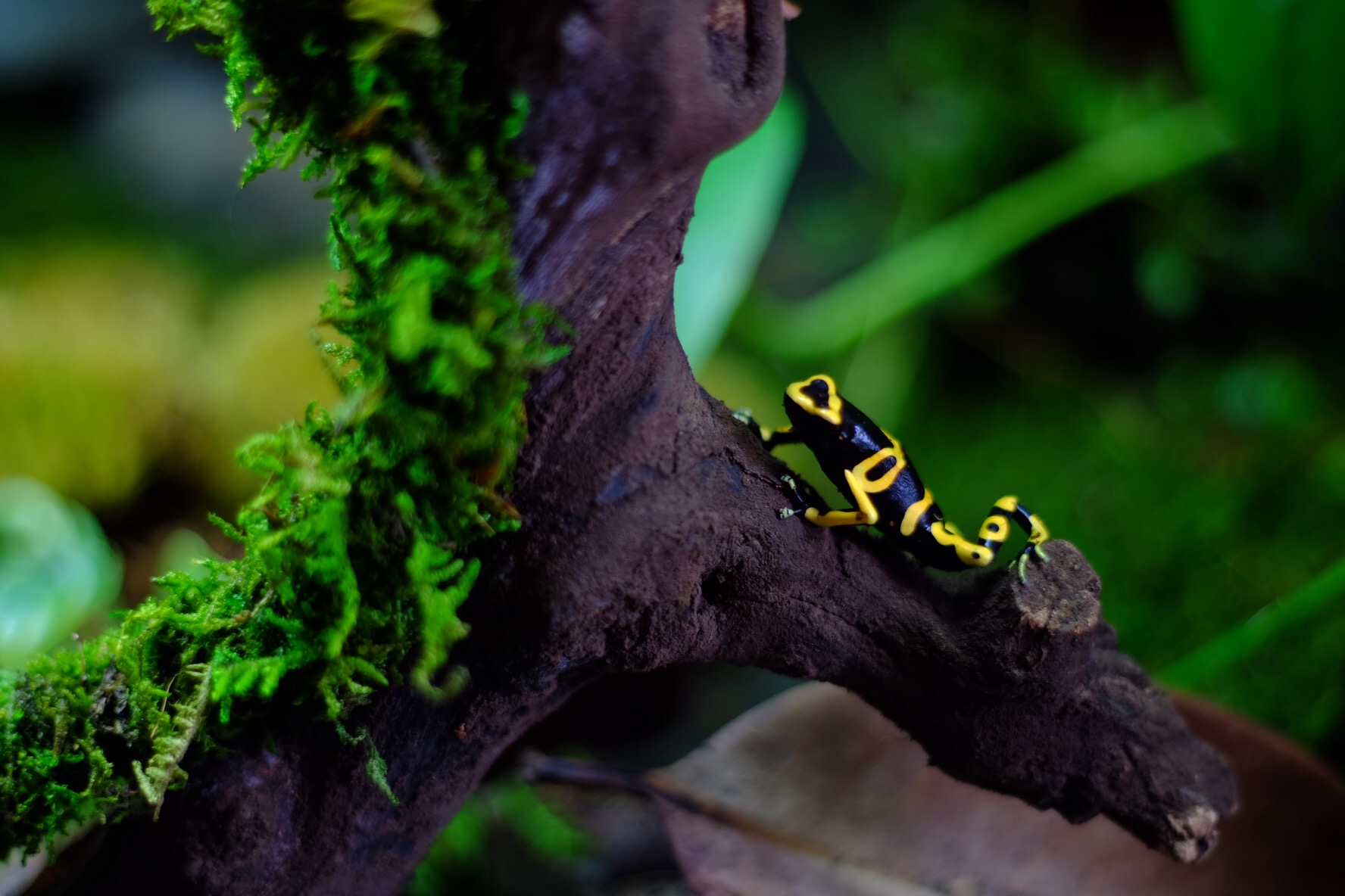 July 31, 2016 Leucomelas hunting for food Posted by By Jeff Golenski Posted in Fauna, Paludariums, Poison dart frogs, Terrariums, Vivariums A dendrobates Leucomelas appears in a yoga pose as she hunts springtails on this mossy branch.dendrobates leucomelas hunting for springtails